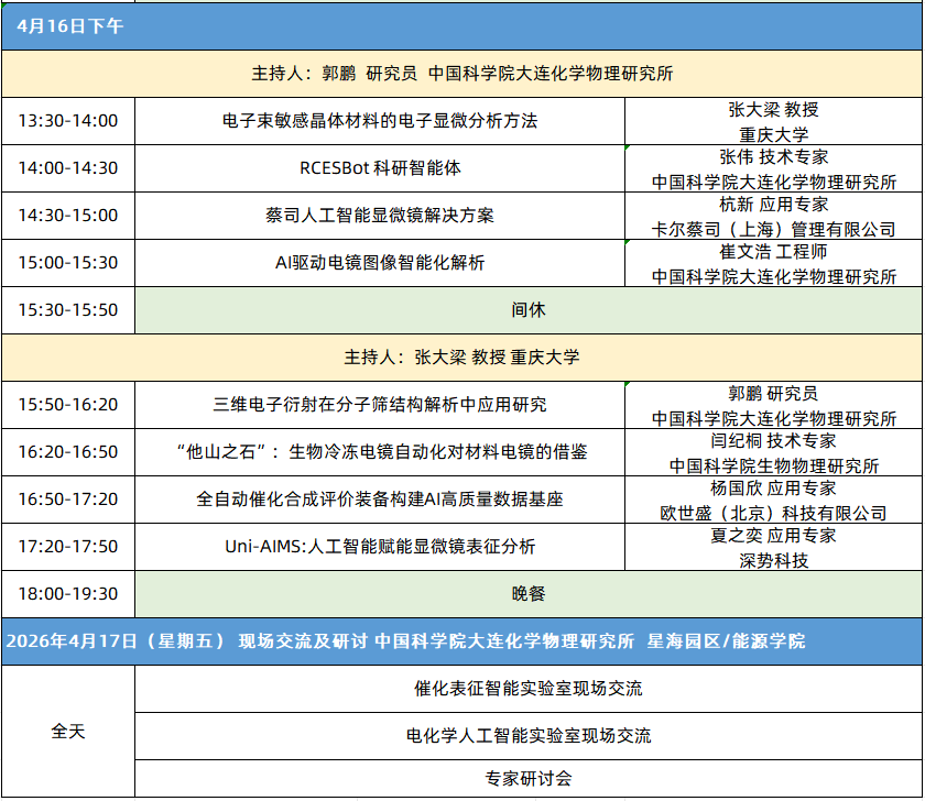 AI赋能的能源催化与电镜技术前沿研讨会将于4月15-17日在中国科学院大连化学物理研究所能源基础五号楼一楼会议室举行。
