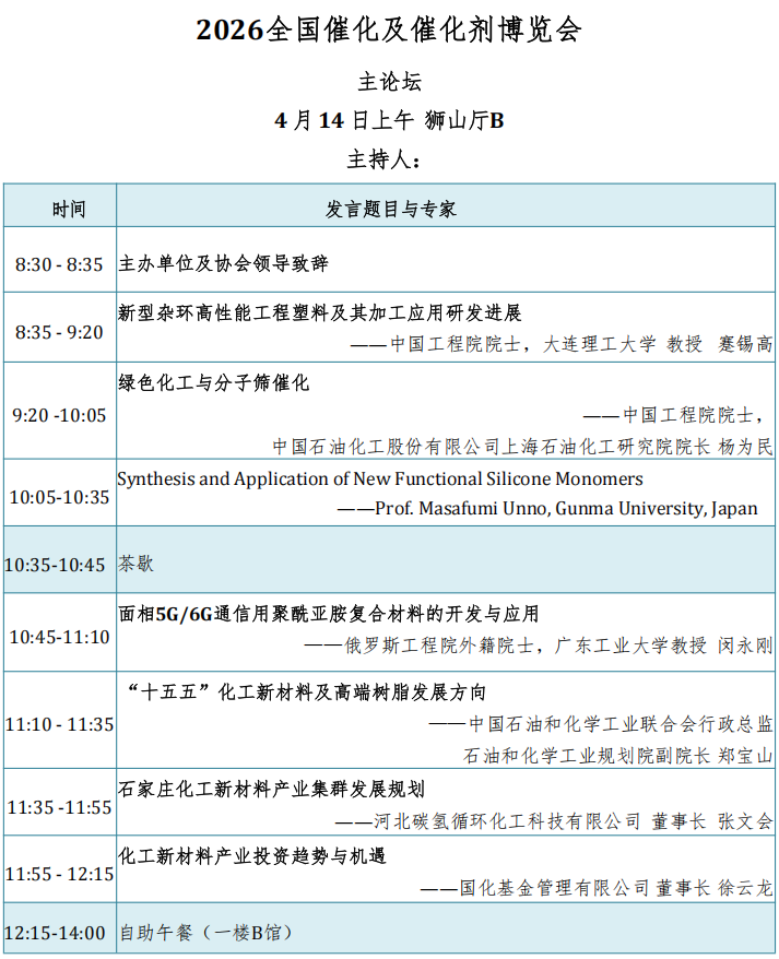 2026全国催化及催化剂博览会(NCCE2026)将于4月13-15日在江苏·苏州狮山国际会议中心举行,大会由北京国化新材料技术研究院主办。